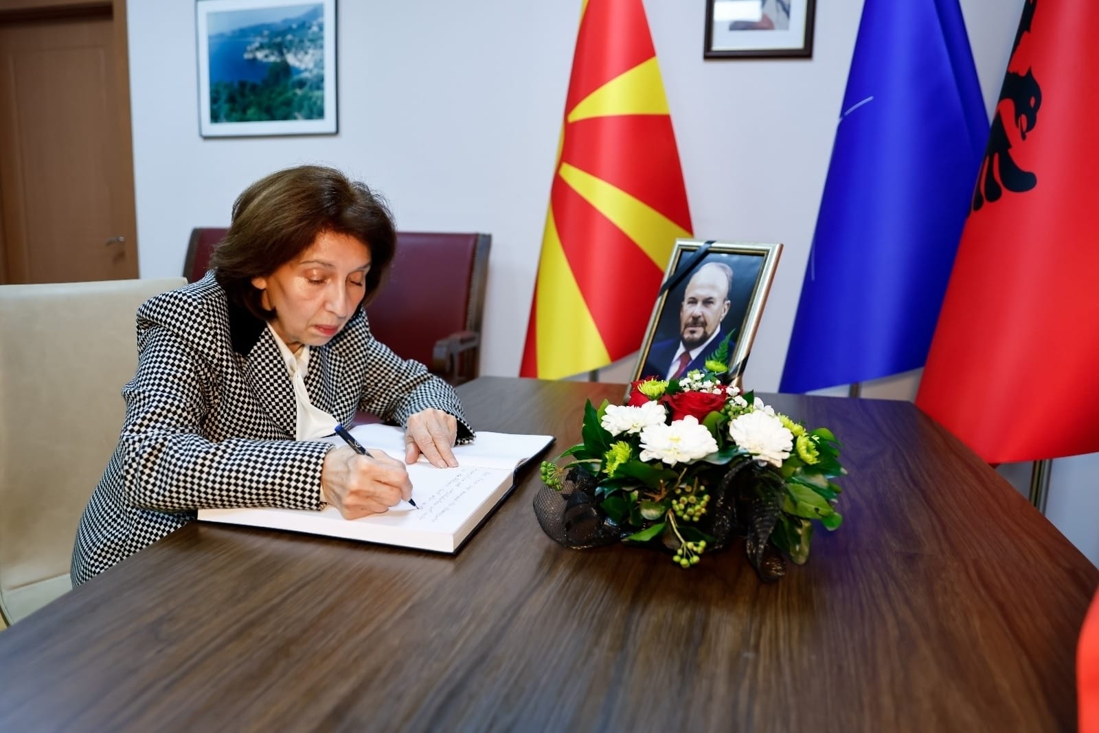Претседателката Гордана Сиљановска-Давкова се потпиша во книгата на жалост, отворена во Амбасадата на Република Албанија во Скопје, по повод смртта на поранешниот премиер Фатос Нано.
